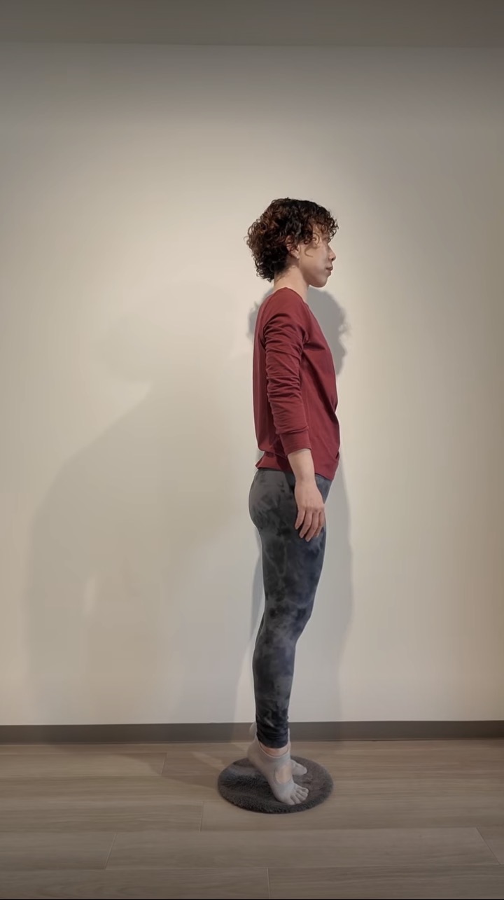 ①つま先と踵をまっすぐ揃え、重心を整えて立つ。