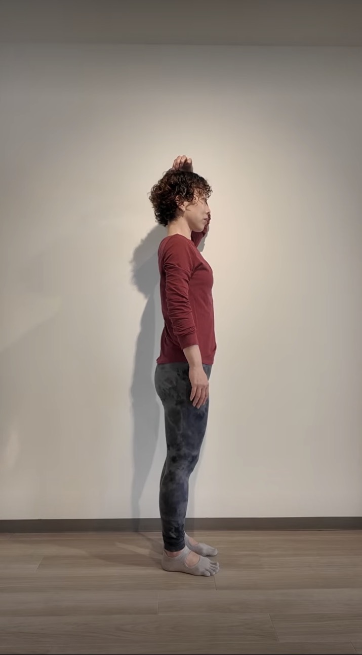 ③つむじから1cm後ろを真上に引っ張るイメージで、上に釣り上げられる感覚をつくる。