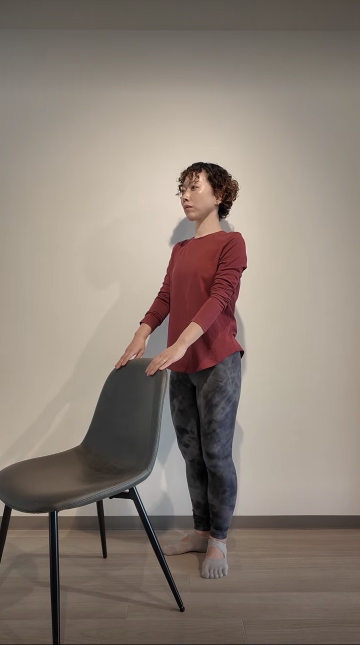①椅子の背などを軽く支えにして、真っ直ぐ立つ。
